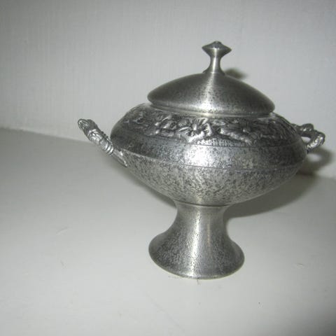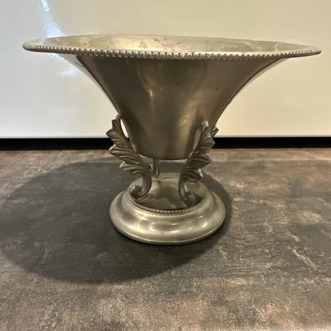 Kolhuttomat ja hienot tina-astiat myydään parina. Karahvin leima kertoo sen olevan norjalaista käsityötä, tuopin kruunuleimaa+ kukkaa (fein zin) en tunnista. Upea kaiverrus kiertää koko tuopin.