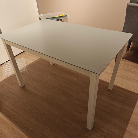 Tukevatekoinen, näppäränkokoinen ruokapöytä 2 hengelle. Pöydän malli muistuttaa pirttipöytää. Pinnoilla on käytönjälkiä, eristyisesti jaloissa on paikoin maalin kulumaa.