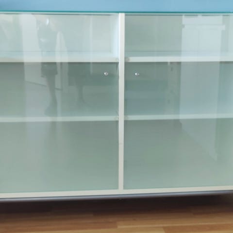 Maalattu suloisen vihreäksi, taustalla tapetti. Lasi hyllyt. Valot lisätty vitriiniin.