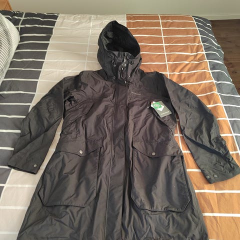 Didriksons pitkä takki naisille, koko 48. Takissa on isot taskut edessä, toimiva vetoketju, sisäpuolella tasku ja kiristysnauha. Takki on moitteettomassa kunnossa. Ohut vuori on ruudullinen. Materiaalimerkinnän mukaan takki on valmistettu polyamidista ja siinä on Didriksons STORMsystem-rakenne, joka on suunniteltu vedenpitäväksi.