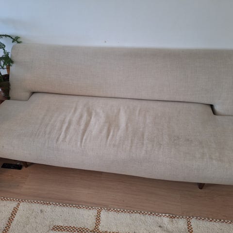 Päällyste vaatii korjausta. Alkuperäinen tekonahka.