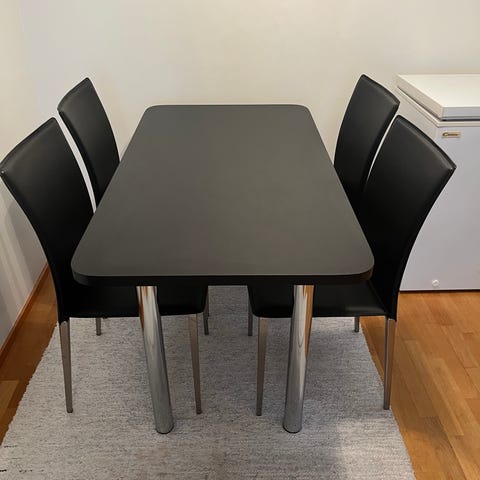Pöytä on hyvässä kunnossa, vähän käytön jälkiä. Tuolit saa kätevästi ylös pöydän alla oleviin tukiin.