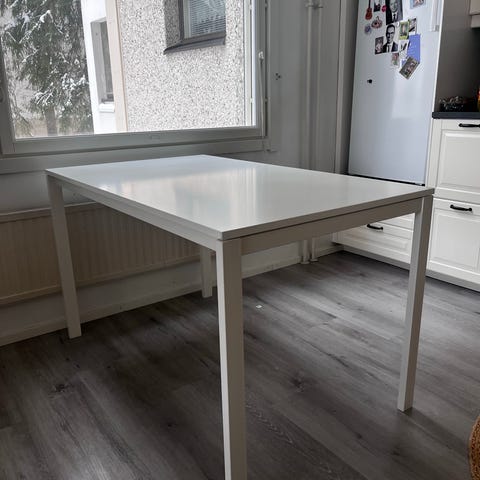 120x75cm ruokapöytä. Kansi harmaa ja jalat valkoiset. Pientä käytön jälkiä kannessa. Pöytä on ehjä ja tästä vielä seuraavalle hyvä pöytä. Neljä ruokapöydän tuolia saa halutessaan mukaan mutta niissä on kangas rikki jaloista ja reunoilta. Eläintalous