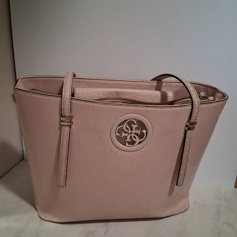 Hyväkuntoinen ruskea Guessin tote. Laukussa on kaksiosaiset kantokahvat ja koristeellinen Guess-riipus edessä sekä kohokuvioitu logo. Sisäosassa on vetoketjullinen päätasku sekä useita pienempiä lokeroita pientavaroille. Sopii hyvin päivittäiseen käyttöön ja tavaroiden kuljettamiseen arjessa.