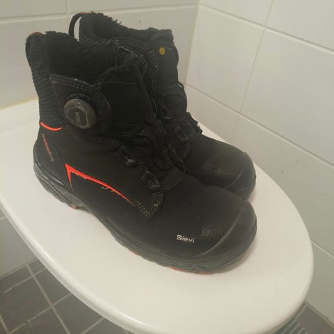 Sievi työkengät, koko 42. Väriltään mustat punaisilla yksityiskohdilla. Kengissä on tarrakiinnitys ja matala varsi. Pohjassa flexstep-merkintä, antistaattinen ja öljyä kestävä pohja. Soveltuvat työ- ja suojakengiksi ympäristöihin, joissa tarvitaan pitävää ja kulutusta kestävää pohjaa.