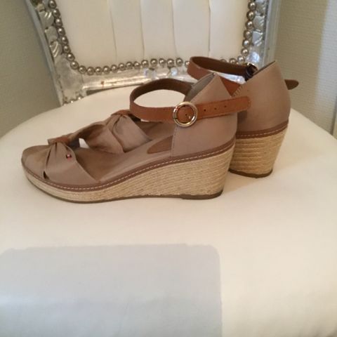 Tommy Hilfiger sandaalit, koko 39. Kiilakorkomalli, jossa ruskeat nilkkaremmit ja T-remmi sekä vaaleat rusetilla koristellut kangasosat edessä. Kiilakorko on kuvioitu.. Värit beige ja ruskea. Sopivat esimerkiksi kesäkäyttöön ja siistimpään arkipukeutumiseen. Postitus onnistuu, ei toridiiliä.
