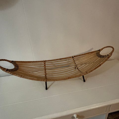 Hyväkuntoinen vanha rottinki tarjotin lasilevyllä. Leveys/korkeus 27/21cm, korkeus 16cm.