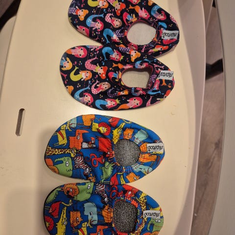 Käyttämättä jääneet Shepherd-merkkiset tossut lampaannahkaa koossa 20/21. Sivulla kätevät tarrat, jotka helpottavat pukemista.
