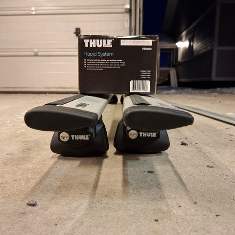 Todella hyvässä kunnossa olevan Thule 4658 kattotelineet. Valitettavasti suojakotelon avain puuttuu. Ollut 2012 VW Multivanissa.