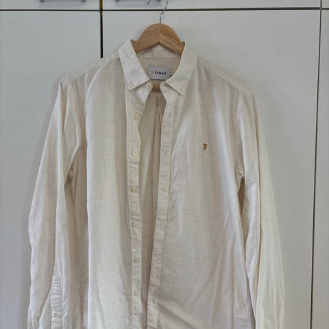 Koko S. Valkoinen kangaspaita, jossa pieni musta pilkkukuosi.