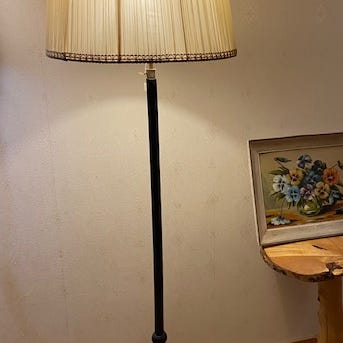 Vanha jalkalamppu. Toimiva. Kaksi lamppua. Varjon halkaisija 41cm. Korkeus 140cm. Vain nouto.