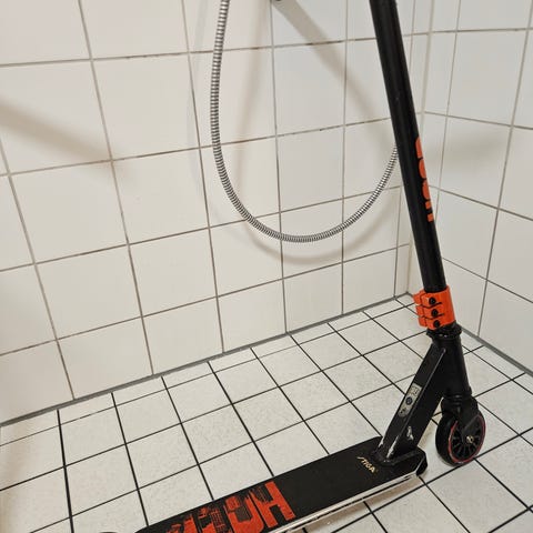 Scuutti on ollut aktiivisessa käytössä ja siinä on runsaasti kosmeettisia jälkiä. Dekin pohja ja kyljet ovat kuluneet grindauksesta, ja maalipinnassa on hankaumia ympäriinsä. Teknisesti lauta on kuitenkin vielä käyttökelpoinen ja sopii erinomaisesti esimerkiksi ensimmäiseksi laudaksi harjoitteluun, jota ei tarvitse varoa.