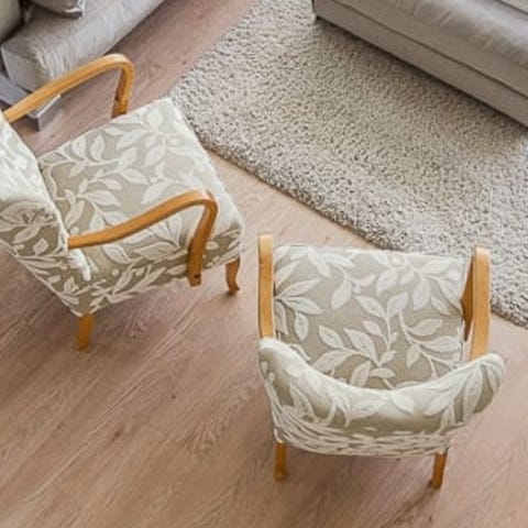 Sohvatyynyt on verhoiltu turkoosinsinisellä huonekalukankaalla. Tyynyt eivät ole alkuperäiset.