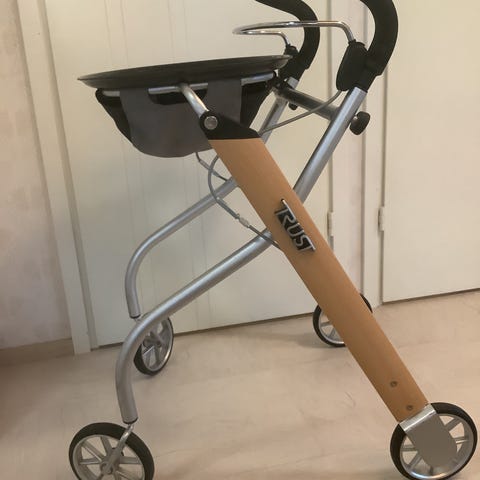 Rollaattori, jossa on vaaleansininen runko ja mustat käsikahvat sekä jarrut. Varustettu mustalla istuimella ja metallikorilla tavaroiden kuljettamista varten. Suuret etupyörät ja takapyörät helpottavat liikkumista sisätiloissa ja ulkona tasaisilla alustoilla. Sopii käyttäjälle, joka tarvitsee tukea kävelyyn ja mahdollisuuden levähtää istuimelle.
