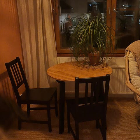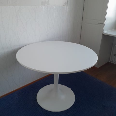 Ikea Mariedamm Pyöreä ruokapöytä ja neljä tuolia. Pöydässä on harmaa kansi ja musta jalka. Tuoleissa on musta istuinosa ja selkänoja, reunoissa puunsävyinen viilu sekä metallijalat. Sopii ruokailutilaan tai keittiöön 4 henkilölle istuinryhmäksi.
