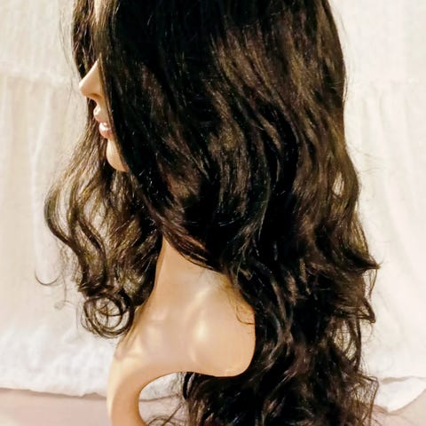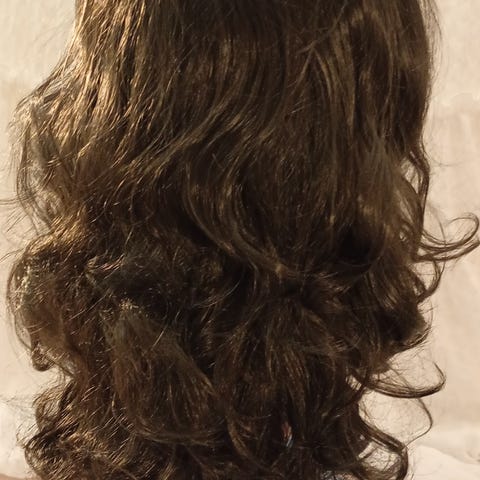 Lyhyt tummanruskea kihara peruukki. Mallissa on epäsymmetrinen, hieman sivulle laskeutuva otsatukka ja kerroksittain leikattu niskaosa. Aitohius peruukki ,kaunis pehmeä hius.49,-
