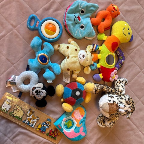Myydän pakettina kuvassa näkyvät vauvan lelut.