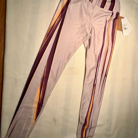 Koko M. Monivärinen, kuviollinen kangas tummalla pohjalla. Joustava, ihoa myötäilevä materiaali, joka sopii sisäliikuntaan ja saliharjoitteluun. Takana pieni vetoketjullinen tasku pienten tavaroiden säilytykseen treenin aikana ja edessä kiristysnauha.
