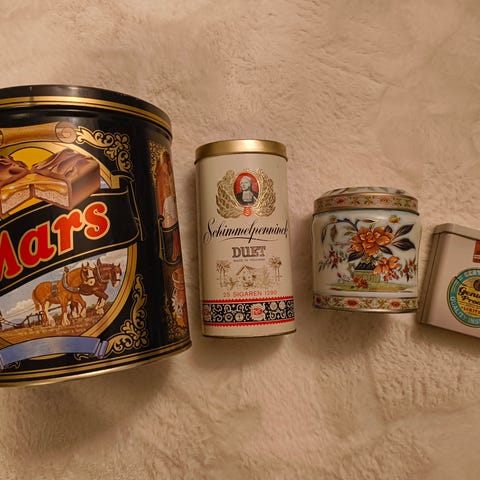 Erilaisia metallipurkkeja. Osa on paremmassa kunnossa ja osa huonommassa kunnissa. Nouto