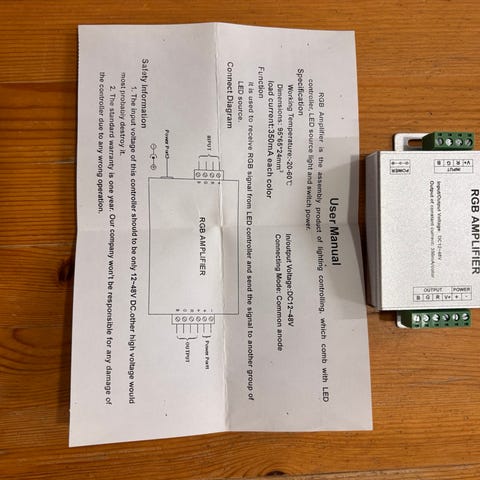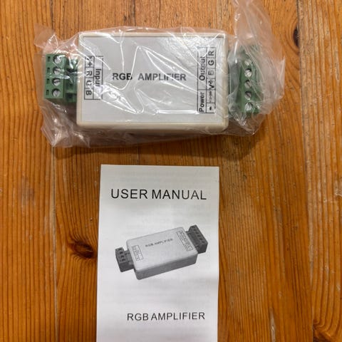 Tämä yksikkö liitetään RGB-säätimen ulostuloon ja saadaan kasvatettua kuormaa 4 A/kanava. Yhteen säätimeen voi laittaa useampia vahvistimia. Järjestelmää voi käyttää yhdellä yhteisellä tai useammalla erillisellä virtalähteellä.