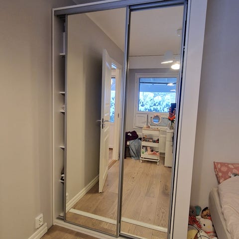 Myynnissä kuvan mukaiset liukuovet. Myydään joko kaikki tai pareina. Myynnissä siis leveys 120cm x korkeus 245 cm aukkoon olevat liukuovet. Jos kaikki ovet ostaa ni saa sillä leveys 240cm x korkeus 245cm kokoisen aukon peitettyä. Kiskot löytyy myös. Koko setti 250€ ja vain toiset ovet 125€.
