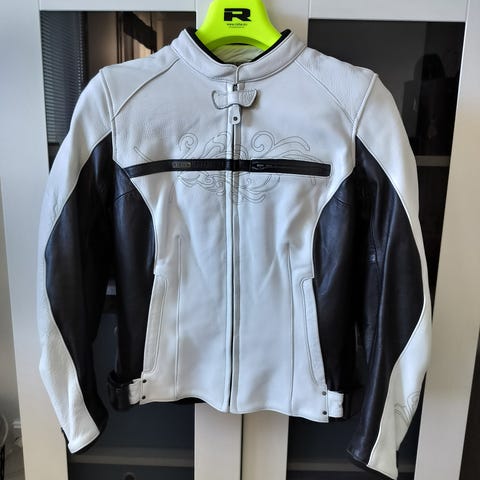 Erittäin siisti, kaunis Richa-ajotakki, musta nahkainen, koko 44 (UK 16), jossa naiselliset leikkaukset ja koristekuviot edessä ja selässä. Sisäpuolella on irrotettava tikattu vuori ja useita sisä- ja ulkotaskuja. Selkä-, kyynär- ja olkapääsuojat. Kuin uusi, muutaman kerran käytetty.