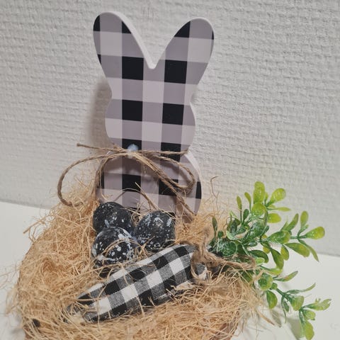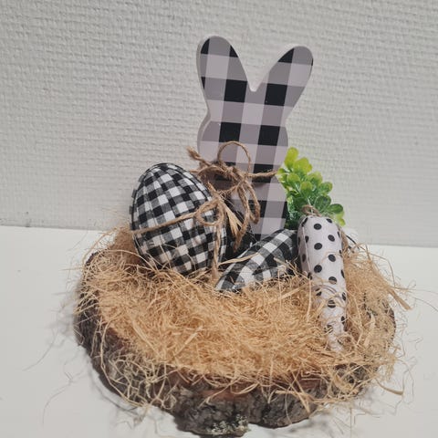 Pääsiäiskoriste kangaspupuja. Pehmeitä, kankaasta valmistettuja pupuhahmoja eri kuoseilla, kuten raidallisena, ruudullisena ja pilkullisena. Sopivat pääsiäisen sisustukseen esimerkiksi hyllylle, tasolle tai lastenhuoneeseen. Pupuilla on koristeena naru- tai kangasnauha vyötäröllä.