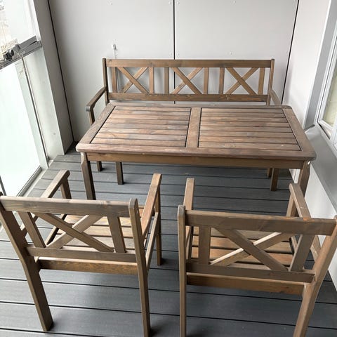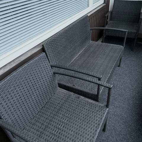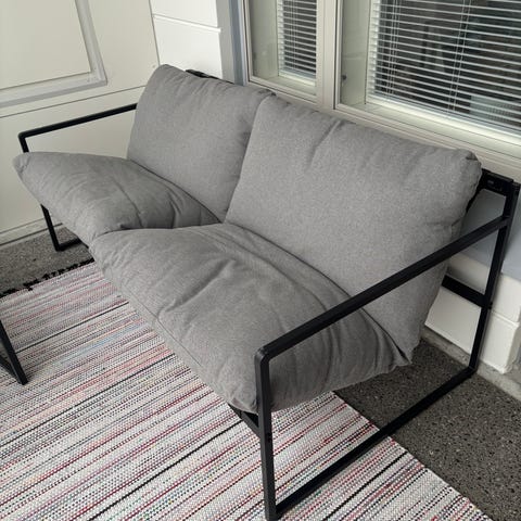 Parvekesohvaryhmä, johon kuuluu kaksi nojatuolia, kaksiosainen sohva, matala suorakulmainen pöytä, kaksi harmaata tyynyä, pyöreä juuttimatto sekä aurinkokennokäyttöinen valaisin. Istuinten runko on mustaksi maalattua metallia ja istuimissa on harmaat pehmustetyt tyynyt. Pöydässä on musta lasinen taso. Kalusteet sopivat parvekkeelle tai terassille ulkokäyttöön. Kokonaisuus tarjoaa istumapaikat useammalle henkilölle ja on helppo sijoittaa kapeallekin parvekkeelle. Mittauskuvassa näkyvät 3 pientä reikää sohvatyynyssä käytännössä ainoat käytön jäljet. Myydään pakettina, vain nouto.
