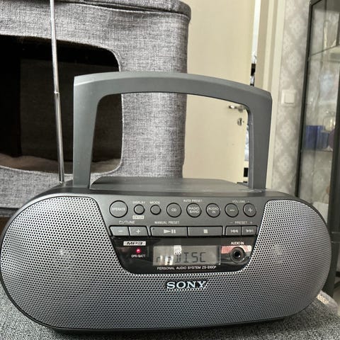 Nyt olisi myytävänä kuvien hyväkuntoinen ja täysin toimiva, näppärän kokoinen pieni boombox. Sony CFD-S03CP on kannettava CD-kasettisoitin, jossa on sisäänrakennettu radio. Laitteessa on CD-soitin, kasettipesä ja FM/AM-radioviritin. Etupaneelissa on LCD-näyttö sekä painikkeet toistoa, nauhoitusta ja radion esiasetuksia varten. Laitetta voidaan käyttää verkkovirralla (230 V, 50 Hz, 12 W) tai paristoilla (R14/C-koon paristot). Toistaa poltetut levyt sekä mp3 tiedostot. Kaukosäädintä en löytänyt mukaan.
