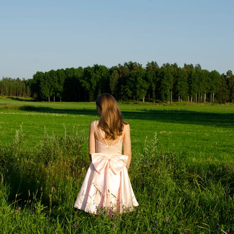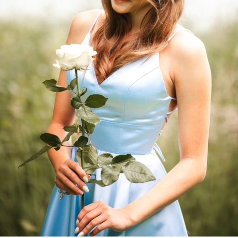 Vihreä, polvipituinen satiinimekko ohuilla olkaimilla. Edessä syvä V-pääntie ja takana avonainen selkä nauhakiinnityksellä. Täydellinen rippimekoksi 👌