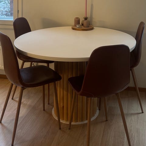 Myydään tiikkiviilutettu ruokapöytä. Runko puuta. Sisältää kaksi jatkopalaa (25 cm/kpl), joilla saa pöytää pidemmäksi. Jatkopalat ovat pöydän sisällä, asennetaan pöydän keskelle. Pöydän pinnassa ja jaloissa on kulumaa ja "värivirhettä".