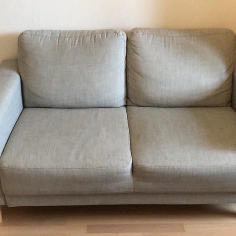 Kuvien mukainen sohva. Kulunut ja kulmassa reikä, mutta muuten ei melko ok kunnossa.