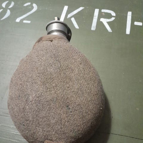 Toinen pullo joka joutaa kokoelmasta. Suojeluskunnan käyttämä juomapullo. Suoja hieman kärsinyt ja nahkalenkki haljennut. Muuten ei vikaa. Korkissa leima Sky.30 Peltiseos ja nahkalenkissä on F. Niskalan Lapuan tehtaan hevosleima, joka tehti merkittävän osan nahkatöistä Suojeluskunnille