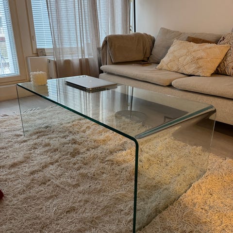 Kaksitasoinen lasinen sohvapöytä. Ylempi taso 45cm ja alempi 20cm korkealla.