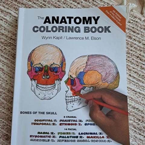 Complete anatomy coloring book. Noin 5 sivua on väritetty