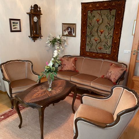 Sohvaryhmä, johon kuuluu kolmen istuttava sohva, kaksi nojatuolia ja suorakaiteen muotoinen sohvapöytä. Kalusteissa on koristeellisesti muotoiltu puukehys ja vaalea, kuviollinen kangasverhoilu. Sohvapöydässä on puinen jalkaosa ja tumma pöytätaso. Ryhmä sopii olohuoneeseen tai edustustilaan, jossa arvostetaan klassista ja perinteistä sisustustyyliä.