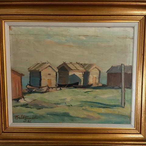 Selkäinahon öljyvärimaalaus vuodelta 1967.hienoissa kehyksissä. Palosaarelta aihe. Koko kehyksineen 62x47cm.
