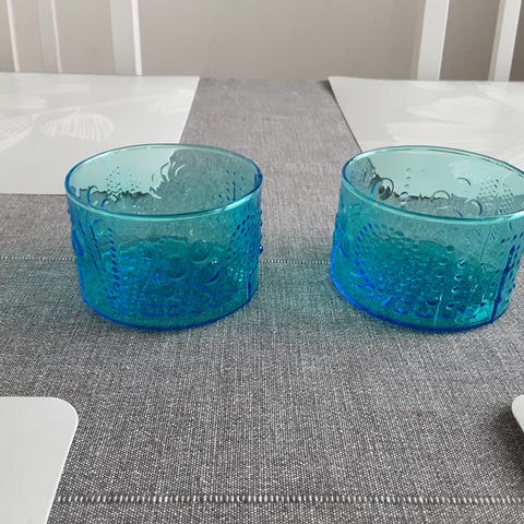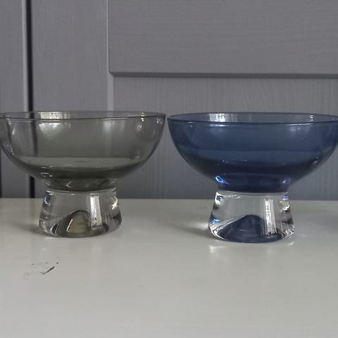 4 x Nuutajärvi Flora jälkiruokakulhot ohutta lasia (Oiva Toikka). Olleet vitriinikoristeina. Halkaisija 8cm, korkeus 5,3cm. Hinta yht. 40€.