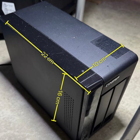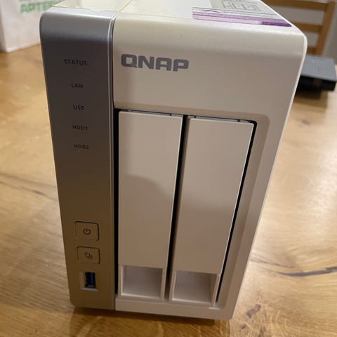 Takapaneelissa on tuuletin jäähdytystä varten sekä liitännät, kuten verkkoliitäntä ja USB-portit. Sisällä on kaksi levypaikkaa, joissa levyt ovat asennettuina kelkkoihin, mikä helpottaa levyjen irrotusta ja vaihtoa. Mukana on verkkokaapeli kuvien perusteella.