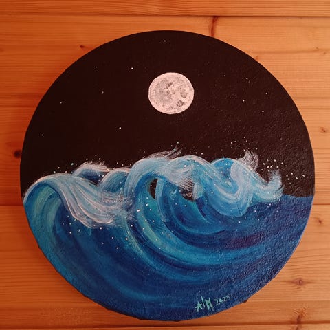 Aaltopahville akryyliväreillä maalattu. Ripustusvalmis. 20e+ postit tai mh.