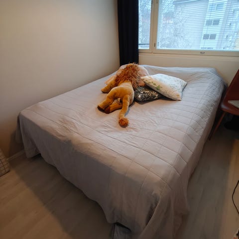 Puinen sängynrunko korkealla päädyllä ja koristeellisilla yksityiskohdilla. Sängyssä on vaaleat Wellpur-patjat. Ostettu v. 2018. Kehikon korkeus 35 cm. Ollut vierasvuoteena vähäisellä käytöllä viimeisen vuoden. Nouda pois muuton alta, viimeistään 14.3.2026.