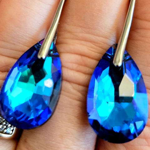 Glitter kristallikorvakorut naisille. Riipusmalliset korvakorut, joissa on suuret kirkkaat pisaranmuotoiset kristallit ja metallinvärinen kiinnitys. Sopivat käytettäväksi esimerkiksi juhla-asun kanssa tai muuhun pukeutumiseen, jossa halutaan näyttävä kristalliyksityiskohta.