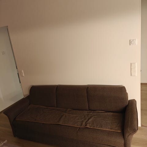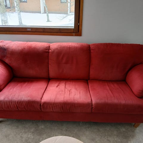 3-istuttava sohva, viininpunainen kangas. Kangas istuinosasta rikki.