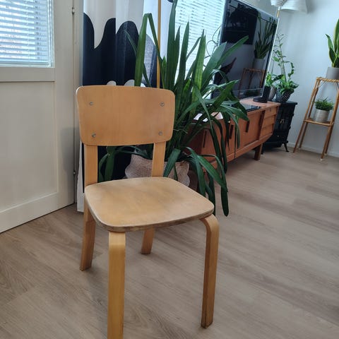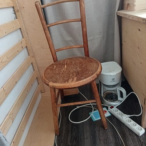 Vanha puinen tuoli. Ehjä, mutta heiluu vähän ja maalipinta kulunut. Tuettu parilla kulmaraudalla pohjasta. Mutta kaunis ja toimiva vielä.