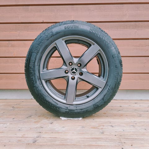 Ostin renkaat ja vanteet loppukesästä 2025. Renkailla on ajettu alle tuhat kilometriä; valtaosa ´näppylöistä´ näkyy vielä.