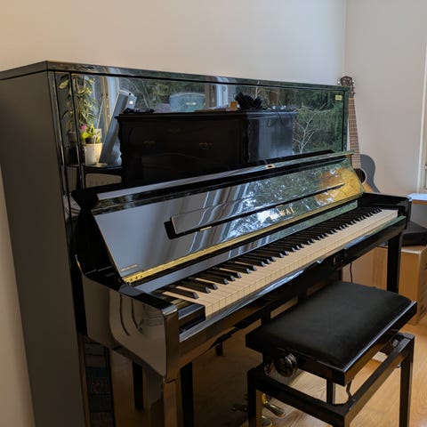 Mukaan tulee jalusta ja pedaali. Näitä pianoja todella vähän myytävänä käytettynä.