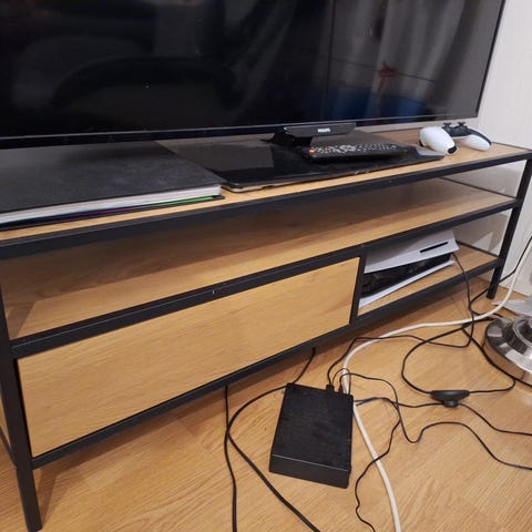 Muudään kuvan mukainen korkeakiilto tv-taso. Jyskistä kai aikanaan hankittu. Kestää isommankin telkkarin. Kuvassa 75 tuumainen tv.