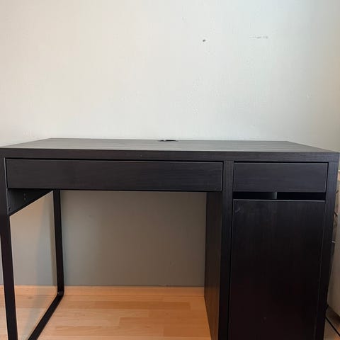 IKEA pöytä vetolaatikolla. Mukaan kuvan seinähylly