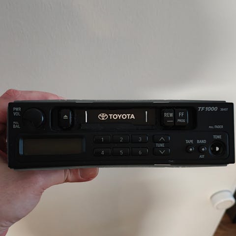 Toyota alkuperäinen autoradio CD-soitin hopea. Laitteessa on CD-soitin, FM/AM-radio, esiasetetut kanavapainikkeet sekä erilliset säätimet äänenvoimakkuudelle ja viritykselle. Etupaneelissa on useita toimintonäppäimiä, kuten taajuusvalinta, raitavalinta ja äänensäädöt. Takana on useita liitinportteja auton johtosarjalle. Sopii Toyota-henkilöauton alkuperäiseksi soittimeksi, tarkka yhteensopivuus kannattaa varmistaa oman auton mallin ja vuosimallin perusteella liitinten ja mittojen mukaan.