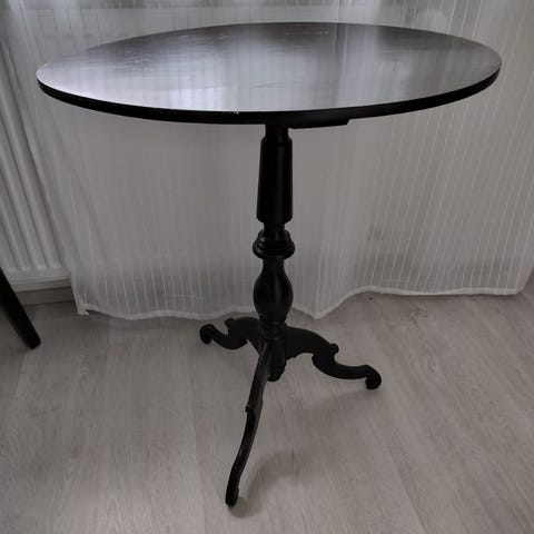 Myydän tiikinvärinen sohvapöytä / sivupöytä. Yleisilme siisti, mutta pientä kulumaa siellä täällä. Pinnassa pientä pinttymää, joka näkyy tietystä kulmasta katsottuna. Pöytälevy ei ole kiinnitettynä jalkoihin millään tavalla, joten sen saa helposti nostettua pois.